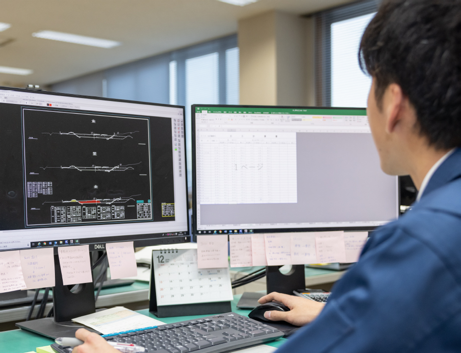 現在は、主に道路改良工事(バイパス工事・拡幅工事)や河川改修工事の積算を担当しています。作業内容としては、数量計算書および設計図面の修正作業、県の積算基準書に則って積算システムにて工事費の算定、積算根拠資料の作成を行っています。